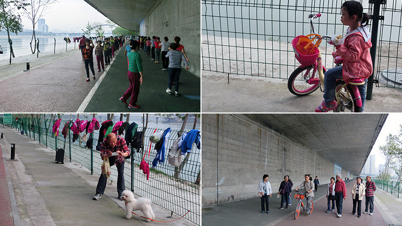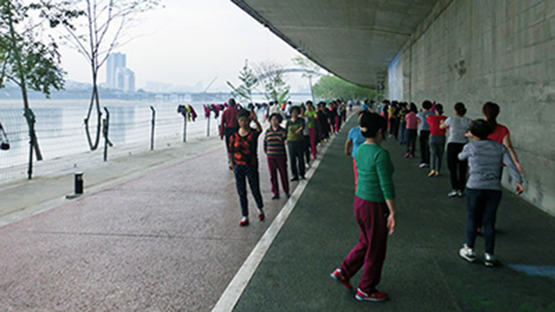 我们在平台上悠闲散步,并以涪江和越王楼为背景拍照留念,还从沿途楼梯下行到江边大道游览,看到这样一幅情景:几十名老大妈在“屋檐”下跳广场舞,她们携带的五颜六色衣物挂在铁丝护栏上,一个可爱的小女孩、一只白绒绒的宠物犬在涪江旁等候……在离渤海之滨千里远的四川盆地,同样也有许多同胞陶冶在健身的娱乐活动,享受着太平盛世的安宁,我为广袤祖国的繁荣昌盛、亿万百姓的安居乐业而深感幸福和自豪。