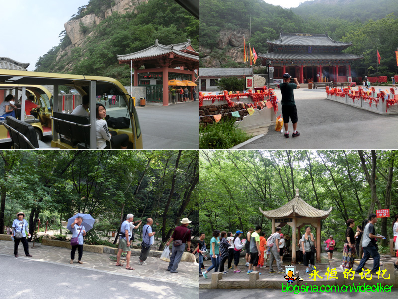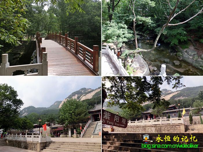 赵姑娘跟大家说:"这条山路途径紫阳观可直达索道下站,一路上的风景很优美,腿脚好的沿着山路前行,步行困难的随我乘坐游览车"。只有三位老同学(其中有我)选择了乘车,由于游览车须等人员够数才能出发,故车追上选择步行的同学时,他们已经走到药王府所在位置,走出大约有一半路程了(见图04)。车到紫阳观,我与同车的大钟同学先行游览,这里的景色很是别致,楼亭飞檐,小桥流水,很有些南国风情。一块标牌指向紫阳观,高高的台阶的供桌上写有"财神"二字,七旬年龄的我们再不会令财神喜欢,故我俩也懒得进入朝奉。(见图05)