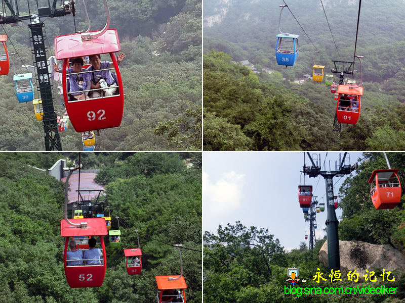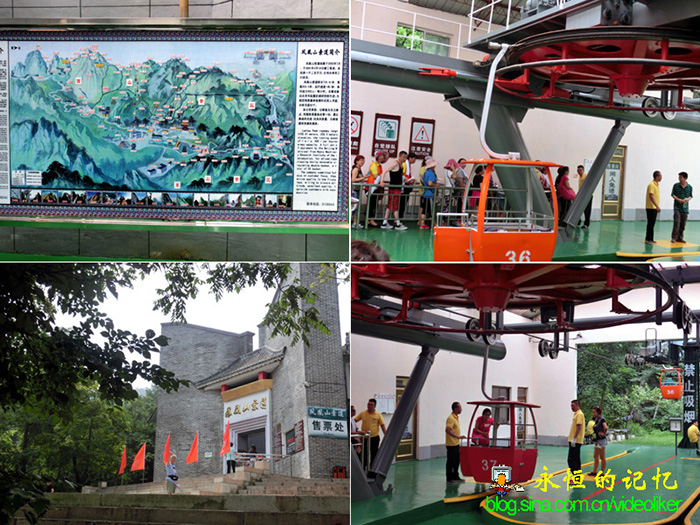 等大家均抵达紫阳观所在位置,在赵姑娘陪同下,一部分老同学留在原地凉亭里休息,另一部分(六人)在赵四弟的带领下向索道下站方向进发,其中就有我与夫人。好在路不远,到那里,北京的王同学争抢着去购票(单程50元/位),我夫人害怕乘坐高空缆车,但看到老同学盛情难却,只得硬着头皮加入。真想不到,来乘坐高空缆车的游客很多,转圈排队等候了将近半小时才轮到。当巨大的轮盘绞动钢缆转动,一只只双人缆箱从索道下站腾空而出,我与夫人乘坐在同一个缆箱中(见图10首张照片),一开始真有点害怕和担心,但看到缆车平稳滑动,且听到巨大铁柱上安装的音响传出的乐曲,心情随之放松和兴奋,尽情地享受在凤凰山麓上空飞翔全长880米的感觉。低头下望,只见茂密的丛林树梢一片片从脚下掠过,尽管随着山坡树梢高低起伏,但由于缆箱连接钢缆弯杆结合处的滑轮会自动保持水平状态(自己分析),所以感觉不出人体前俯后仰的不适。放眼远望,凤凰山顶峰一大片裸露的绝壁山体近在咫尺,很清晰地看到不少游客在山腰石道上行走,有的石道直上直下,设有铁链条扶手,看得出地势险要。再远处的山头则飘浮在云彩之中,连绵起伏如同一只只弧形的帆船在行走。我与乘坐在前后缆箱的老同学互相拍照,留下了飞越凤凰山麓难忘的瞬间影像。此时此景,想起北宋诗人苏轼"不识庐山真面目,只缘身在此山中"的名句,在这里,却用"识得凤山真面目,只缘身在此山上"更为确切了。(见图09、图10、视频01"乘坐缆车鸟瞰凤城凤凰山")