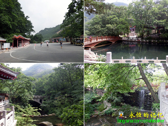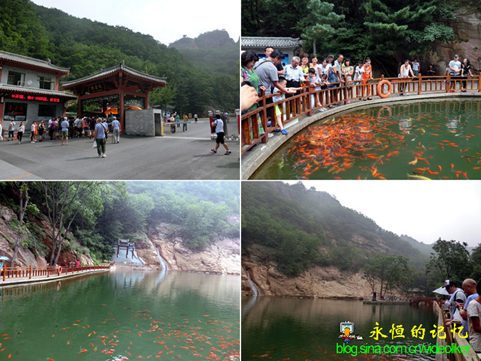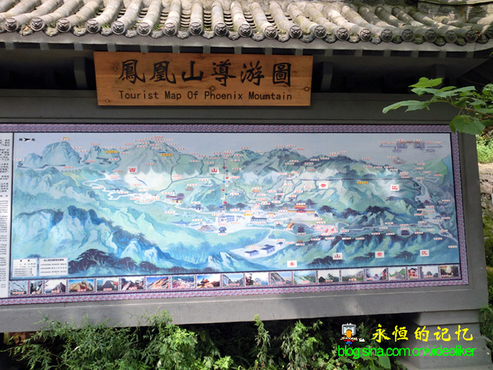 穿过城池中门,就来到景区检票口,我们一行穿着胸前印有卡通人物T恤衫(赵姑娘赠送的礼物)的老头老婆们引起许多游客的好奇,而我们也为此自豪,感觉年轻了二十岁。当我们通过检票口后,视觉突然豁然开朗,正前方是一个紧靠山崖的面积不算太大的一汪池水(称不上湖),山崖上一条水量不太大的瀑布流向池中(赵同学告诉我均为人工修建的),池中有数不清的金鱼在漫游。一条宽阔的石板山路沿着池水蜿延通向远处的青山树丛之中(见图02),从路边的导游图(见图03)中看出,这条山路似乎就是东山景区和西山景区的分界线。池的左侧和山崖之间有一条路通向矗立在高石阶上的三跨牌楼,牌楼顶部写有"东山景区入口"金色大字。我们与许多游客一样依偎在栏杆旁边背向池水和山崖拍照,这是进入景区后的首张留影。