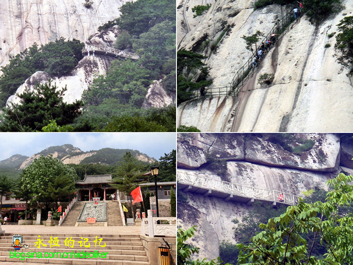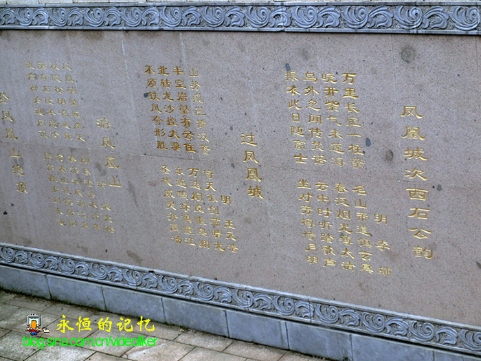 这时,我发现有一凉亭下方石碑刻有好多名人诗词,其中明代李辅(江西进贤人,曾任山东监察御史,辽东巡按御史)著有《凤凰城次西石公韵》一诗:"万里长空一柱擎,名山帝遣镇玄冥。晓开紫气来蓬海,春泛烟光薄太清。鸟外忽闻传梵语,云中时听踏歌声。振衣此日随高士,坐对芳樽待月明。"我以为诗中前四句所写的情景来描述其它名山亦可,只是"鸟外忽闻传梵语,云中时听踏歌声"却写出了凤凰山之险美和特色(见图06)。此时,尽管我站在山下,抬眼可望见悬挂在紫阳观楼阁顶端、西山悬崖栈道行人似乎在云彩中漂浮,可以想象出当年作者攀登至西山悬崖栈道时闻听庙宇道观传出的钟声梵语和攀崖者的脚步喘息声时的感觉和诗韵。如今江山犹存,物是人非,只有文字尚可穿越时空隧道依稀映射当年人物和情景,想到此,不觉感叹嘘嘘。(见图07、图08)