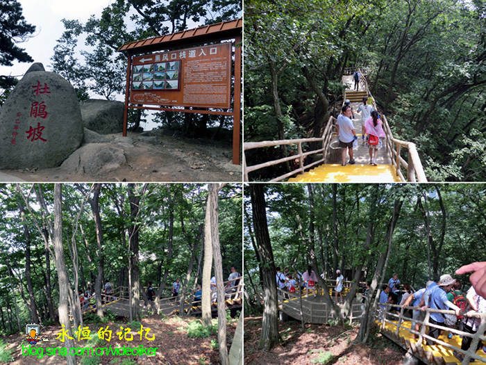 在黑风口栈道上还发生赵同学和赵姑娘之间的一段有趣争执,原由是赵姑娘为了让我们去山腰最险要的崖壁栈道上观览美景,后让赵同学和赵四弟先行一步"侦察",因为他俩也很长时间没来此游览,也不知道尚有多远路程,是否适合我们这群老弱人践行。结果没等他俩返回,我们这群人瞧着这条直下山腰栈道就已望而生畏,决定从杜鹃坡返回中转点,最后赵同学和赵四弟从山腰转了一圈也返回中转站,让赵姑娘感觉很扫兴。我再三打圆场,说明我们这群人不适于走下陡坡栈道去悬壁观览,能够到杜鹃坡观景和合影已经是很满足,赵姑娘的心意我们都领受了。返回途中,我与丹东的王同学夫妇同行,由于王同学早年患腿病,故拄拐走得很慢。她的爱人杨同学也是我们同班同学,他俩相亲相爱的故事,常得老同学们赞扬。这些年他俩一直居住在秦皇岛,帮助儿子儿媳妇带孩子。得知我们要来聚会,特意"请假"回丹东、到凤城来尽地主之谊,这份情意令我们外地来的老同学都十分感动。因我的腿关节也有病,就陪着他俩慢慢行走,聊聊同窗往事和生活趣事,心里感觉很温馨,想想年纪大了,不仅需要亲情,还需要友情,尤其是老同学之间这种无私的情谊。