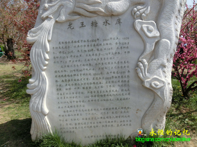 当我们走下大坝,来到坝身一侧的凉亭休息时候,我仰望坝体,感受大坝的坚实巍峨;俯视樱花园,领略公园的灵俊秀美。我倚栏暇想,以往日本在此建造大坝及公园的野心在于长期占领,然而这块神圣的土地早已归属中国人民;却是公园里樱花年年盛开,象征着中日人民之间友谊世代美丽。此刻的龙王塘正绽开她那迷人的笑脸,迎来络绎不绝的八方来客、中外游人,难怪周恩来、朱德、宋庆龄、郭沫若、肖劲光、徐海东等党和国家领导人都曾到此视察,今天,我们也漫步在园区的通幽曲径、花丛林景里,同样产生飘飘俗仙、留连忘返的情怀,此景此境,谁人不是满目春色、满身芬芳呢?!十点半钟,当我们走出公园大门向农家饭庄走去的时候,长龙般的车队正逶迤向公园大门驶来,我戏言:“贪睡的游客就来挨挤挨晒吧!”引来同伴们一阵无恶意的欢笑声。
