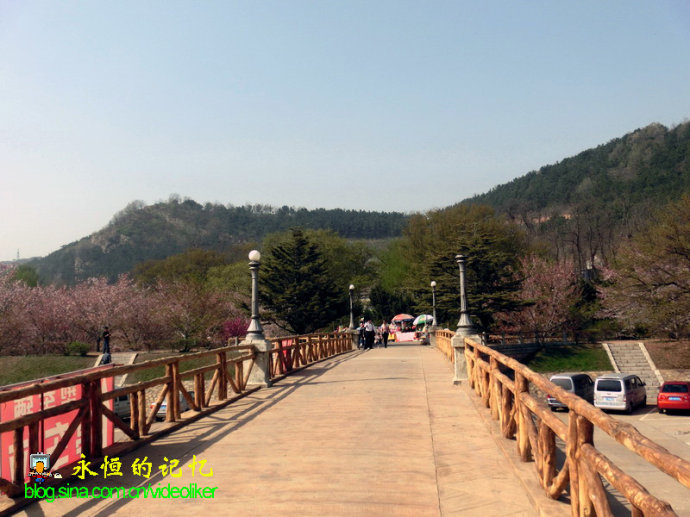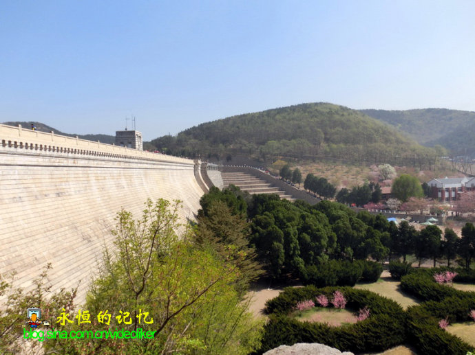 在樱花园里,多亏我携带了三角架,不用求外人就可以顺利地自拍集体照。因为同伴都是老年人,我还携带了一辆小行李车,不仅能放置三角架,还放置了瓶装饮用水,水果等物品,走热了脱下的衣服,也可以塞进小车里。观赏完园林,来到水库大坝底下,征求大家意见是否登顶,大家一致说“不到坝顶非好汉”,其实台阶不长,不一会儿就来到坝顶走桥之上。哇,极目向右望去,丛山峡谷环抱一池泱泱清水映入眼底,阳光洒在水面反射出无数金色波纹,显得那种壮美的宽阔,荡涤着未曾脱离秀美的视线。扭头左望,水库公园与河道都淹没在粉白的花雾里,别有一番迷人情趣。这次轮到我讲述刚从石碑上读来的信息:“龙王塘水库始建于1920年,1924年竣工,1926年初正式送水,水库坝体为石基混凝土结构,全长326.2米,顶宽4.24米,底宽29.82米,最高处38米,水库积水面积为33.9平方公里,最大库容量1578万立方米,日供水能力1.2万立方米,是旅顺城区重要水源之一。”回来后,通过查百度方知,作为国家拉动内需项目之一,龙王塘水库已成为我市的备用水库之一。从2009年3月起,经过建设者一个多月的精心施工,对此大坝进行了加固,更新了我们走过的景观桥,从同年4月26日起,游客们才可登上大坝观光游览。