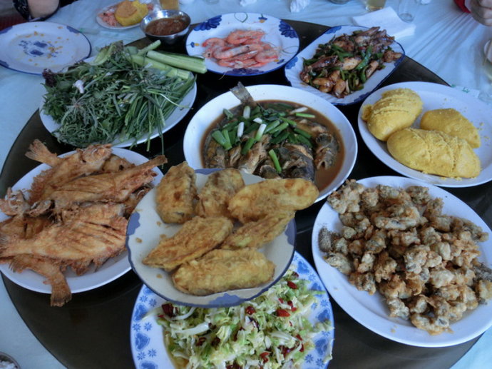 在公园附近一家名为“德民”的农家饭庄点的菜肴和主食:炸偏口鱼,茄子塞肉盒,炸海砺子,家焖黄鱼,酱爆海兔,清煮野生海虾,火爆头菜,野菜沾酱,玉米饼子,很有特色和实惠。