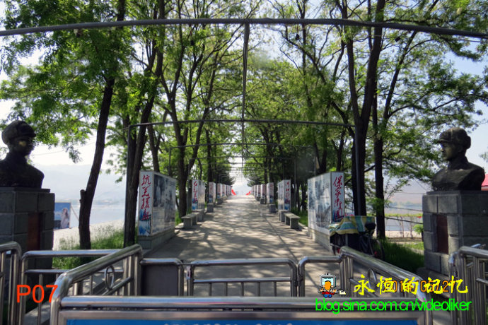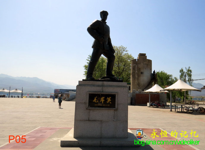 汽车沿着漫水桥向前行进,桥左就是鸭绿江,不大一会儿,我们就来到河口主景地。汽车停泊到新苗一个亲戚开的饭店门前,我们步行到江边参观。首先映入眼帘的是屹立在河口断桥旁的毛岸英烈士雕像。据资料介绍,这座桥原名叫“清城桥”,是1941年日本指令朝鲜当局和伪满洲国共同建造的,是鸭绿江上最早修建的一座公路桥,1951年3月29日被美军飞机炸断,据当年参加过抗美援朝战争的老红军讲,1950年10月19日,当时被任命为赴朝志愿军总司令的彭德怀,还有首批赴朝志愿军中毛泽东的儿子毛岸英,就是从这座桥在晚上秘密渡江作战的。毛岸英的妻子刘思奇为了缅怀他,还在断桥附近修建了一所“毛岸英小学”。如今,断桥依旧在,雕像近桥旁,就是让后人永远铭记这段难忘的历史。我站在雕像前,默默地悼念这位人民的好儿子,也钦佩开国领袖毛泽东的无私无畏。