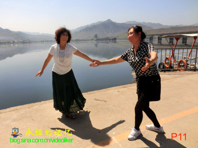 不知什么原因,这个时候的江边游客稀少,一艘艘游艇停泊在那里没人上船,船老大也不知上哪儿去了。新苗和一梅登上一艘游艇前甲板,模仿电影“铁坦尼克号”中一对情人,两人相拥,挥舞双臂,如燕腾飞,呼唤青山。下得船来,一梅起舞,新苗伴唱,引得我与二位夫人也手舞足蹈起来。歌停舞毕,休闲之时,再拍摄集体合影照片,还有黑水拍摄的录像,鸭绿江畔,留下了一段博友情深的佳话。