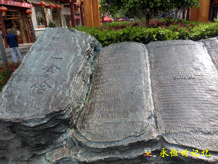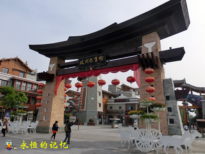 导游告诉我们,按大巴行进路线的便利,上午先去震后新建的“巴拿恰”景区参观。从我们下榻的绵阳到“巴拿恰”大约不到30多公里,我们起个大早赶到那里就是想多看看这个地方。从矗立在“巴拿恰”牌坊旁石碑文字得知,所谓“巴拿恰”是羌语“做买卖的地方”的意思,它位于北川新县城的中轴线上,长582米,宽130米,通过碉楼、廊桥和小广场的设置,形成丰富的天际线,使用片石、原木等建筑材料,房顶平坡结合,是充分体现北川羌族建筑风格的旅游综合体,该旅游胜地由山东威海市和济宁市於2009年12月开始援建,於2010年8月竣工。