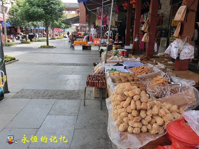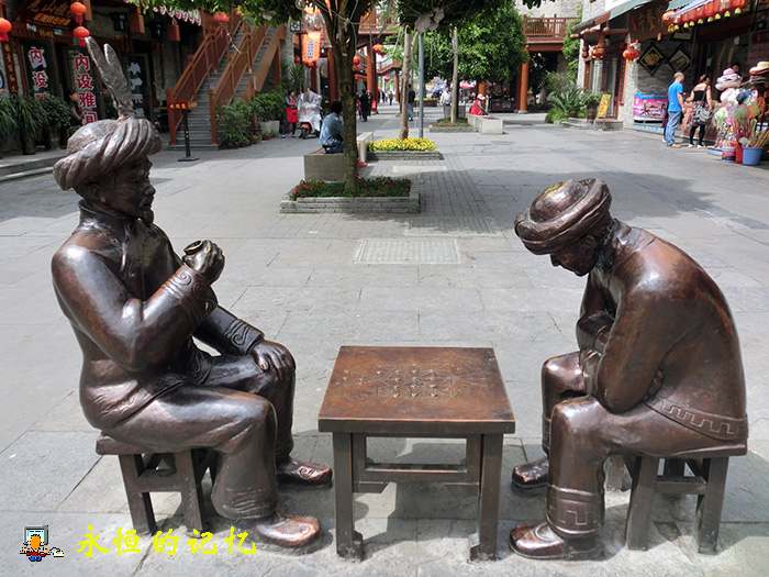 三是沿街行走,街的两旁有许多服饰店、超市、饭店、茶楼和商铺,不管从建筑风格,还是经营商品都体现了羌族的特色,连坐落在街中心的铜塑人像也穿着羌族人的服装。