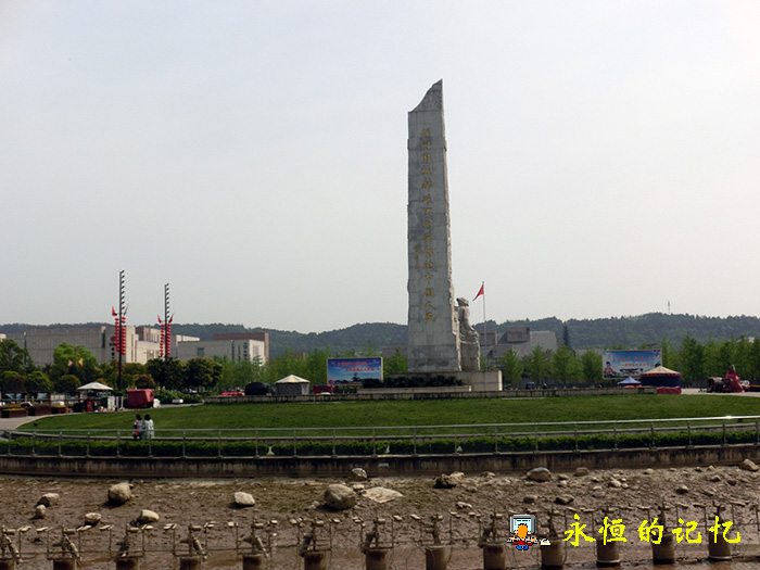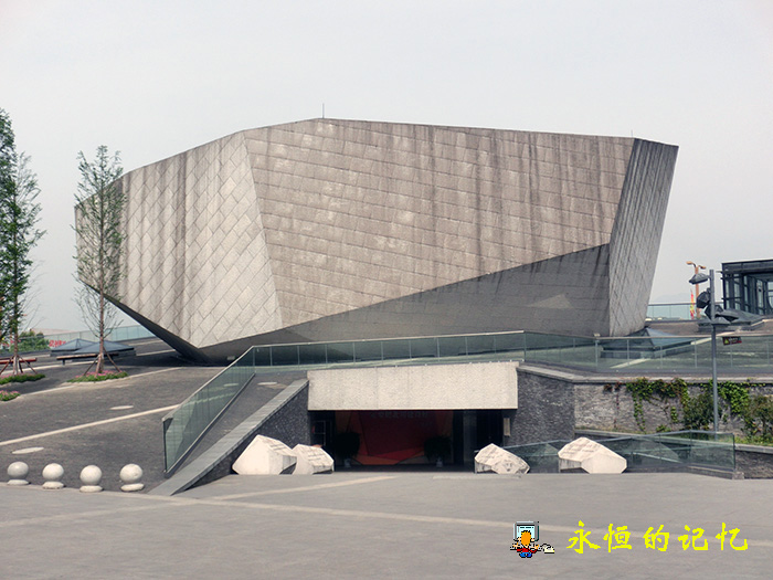 四是街尽头还建有一主体建筑:北川规划展览馆。展览馆的顶部是一块白色巨石,也许意味着地震巨石的下沉,游客可步入下沉的展览馆内参观。而其一旁还有一大片水景地,一块高高的石碑上写有胡锦涛总书记的一句名言“任何困难都难不倒英雄的中国人民!”由于时间的关系,我们没有临近参观,只是以此为背景拍摄了照片。