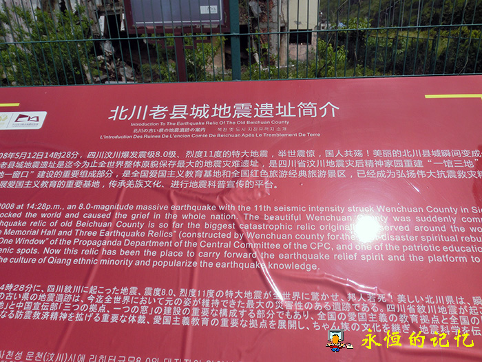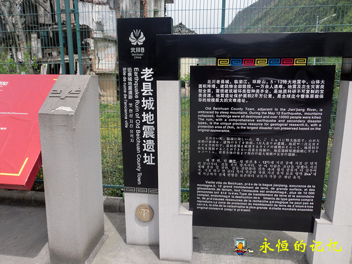 大巴来到一个停车场,我下车一看,原来这里的一个小广场就是北川老县城地震遗址的入口处。广场的一侧围有铁丝网,网外就是震后的断壁残垣,铁丝网里侧竖立着几块大型的示意板,板面标题分别写着“北川老县城地震遗址简介”、“北川老县城地震遗址导览图”、“512汶川特大地震纪念馆”等,从这里入口只能步行,跟随导游我们进入了令我一生难忘的震后遗址区。