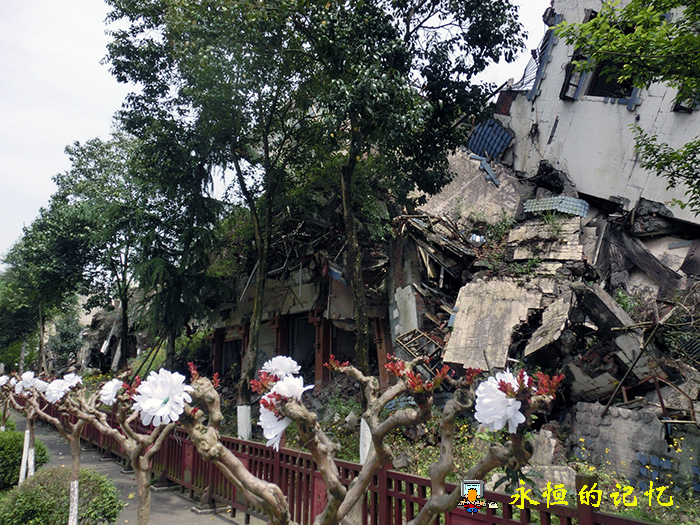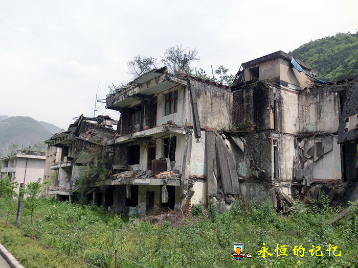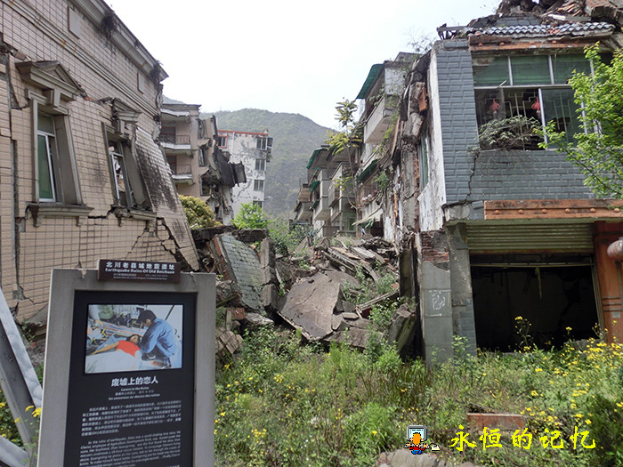 来到震后城市中心遗址区,宽阔的大道上空横框上书写着“深切缅怀“5.12”特大地震遇难同胞”的标语,大道两侧栏杆上系着一朵朵白花,每隔一段残楼边上立有一块木牌,上面书写着楼房原单位,或写有救援时的场景。尽管我也通过媒体读过当年许多抢救被埋同胞的动人故事,但仍被木牌上的故事所震撼和感动,记得有一块牌子上记载了这样一个真实往事:北川县农业银行职工贺晨曦被地震埋在废墟里,她的男友郑广明第一个发现她还活着,在救援人员救援104个小时过程中,他一直趴在废墟上,甚至不顾危险,将头伸进洞口与她说话,直到抢救成功。看到此段,我的眼睛湿润了,被这悲惨但又真挚的爱情故事所感动。类似的故事还很多……我走在北川老县城震后遗址的路上,仿佛耳边又响起九年前千军万马奔赴震区的冲锋号角,眼前又浮现出当危难来临时一个伟大民族的互救和团结场面,心中又激荡起中华人民共和国国歌的旋律和颂扬中国共产党“为民执政”的歌声。