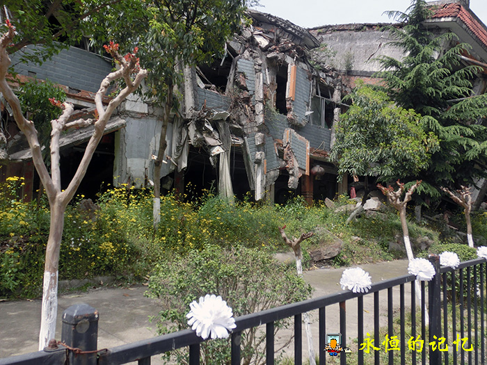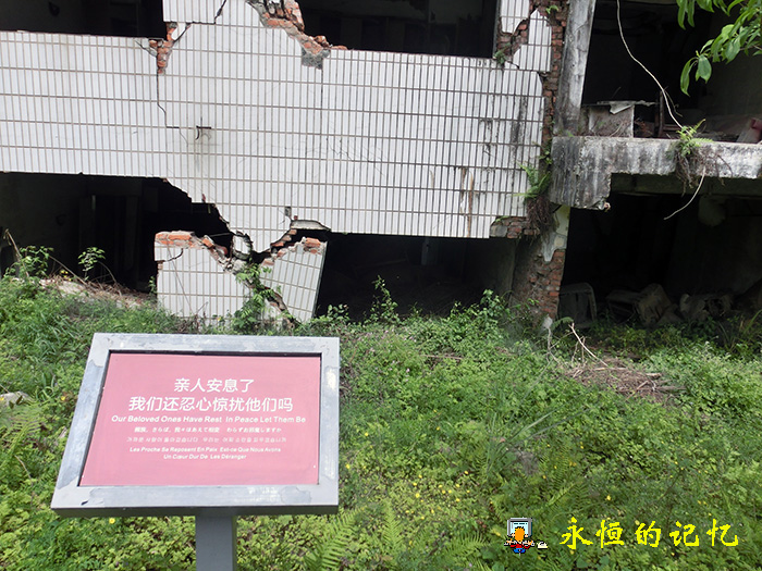 一路走来,映入眼帘的都是被地震震得东倒西歪,危如累卵的楼房废墟,可以想像到,当时大地震发生时候的威力和可怕,以及在天灾面前,我们人类是多么的渺小,在松动的土地和轰然倒塌的山体和楼房之下,死亡的降临是那么的快速和无情。在废墟旁边,有一块粉红底色的木牌,上面书写着“亲人安息了,我们还忍心惊扰他们吗?”路过的同学和家属都放慢了脚步,我对着木牌深深地鞠了一躬,表示对逝去亡灵的哀悼和尊敬。