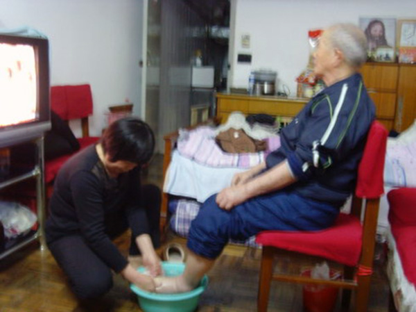 看到阿姨在给我父亲洗脚,尽管她说是她的责任,但我还是让她站起,让我也为父亲洗一次脚,摸着他微肿的腿肤,想起当医生的三妹所讲,这是由于父亲高龄、肾功能下降之缘故,近半年,给他吃中药,已经恢复不少,能够自己在家里慢慢走动。我轻轻地为他擦洗、按摩,禁不住的泪水在眼眶里转,心想当儿子的远在千里,不能常在家孝敬,心里十分愧疚。