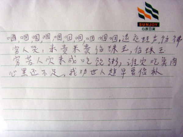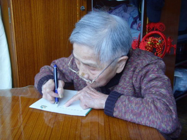 而我母亲,至今其记忆力很好,不仅能够讲述她本人年轻时以及我们儿时的故事,而且能够演唱起她童年时歌谣,有幸我把她演唱“俭朴歌”时情景录制了下来,给我们留下了珍贵的影音记忆(详见以下视频),也许这世界上再没有人传承这首内涵深邃、富有教育意义的歌曲了。她只有小学六年的文化,但能写一手不错的字,我又请她将歌词书写出来,她即能用患有风湿性关节炎、手指变形的右手一气呵成(详见以下图片),令我十分欣慰。用餐时,她还能用勺子为父亲舀菜。七十年的风雨相伴,两位老人相亲相爱,互相依赖,和善待人,也许这就是他们长寿的秘诀之一。