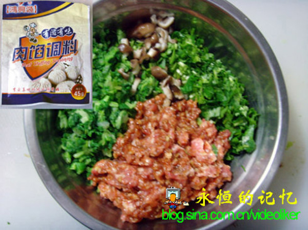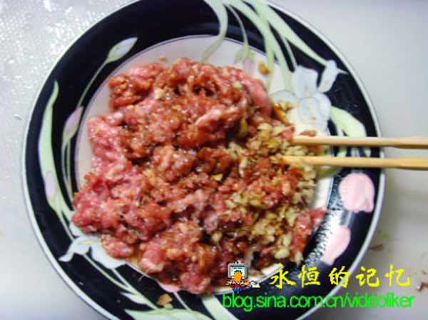 2、选择上好猪肉,剁成肉馅。在肉馅里放入姜末,少许细盐、酱油、料酒、味精和适量“肉馅调料”(从超市购进,内含:肉蔻、桂皮、陈皮、小茴香、干姜、香葱、丁香、白芷、花椒、八角、砂仁。亦可不用。可按饺子馅制作),用筷子顺一个方向搅拌均匀。(见下图)