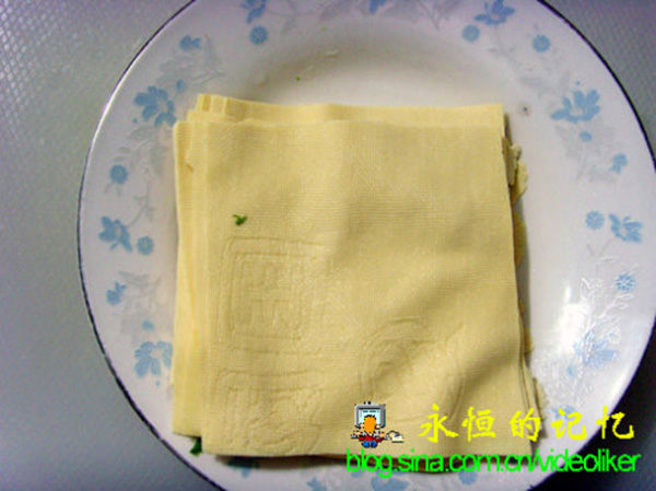1、将上好豆腐皮(南方人常称其为“百叶”)用温水浸泡一下,清洗表面,去除碱味,使其更柔软;(见下图)