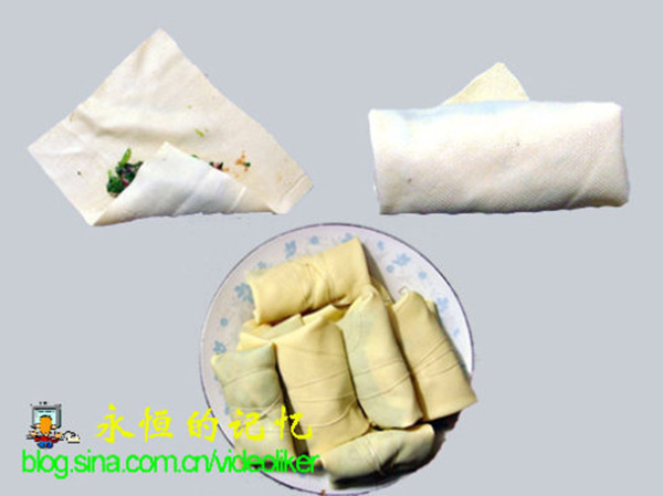 5、用小勺将适量菜馅放到切好的豆腐皮块上,对角折迭包起,再用细线拦腰轻轻捆住(见下图)即包成豆腐皮卷。