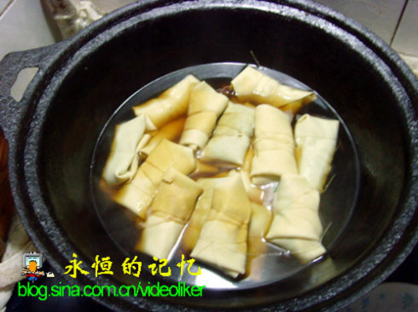 6、在铁锅里倒入猪骨头汤汁(鸡汤汁亦可),放入适量酱油、大料、白糖、味精,将捆扎好的豆腐皮卷依排放入,用大火烧开,再用中火烧煮十分钟,即为成品。(见下图)