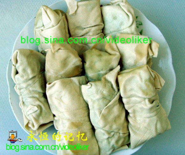 7、用筷子小心将豆腐皮卷捡入大盘中,冷却后,用一把锋利的剪刀将细线剪断,用手指轻轻将细线抽出。此成品即可食用,亦可与别的蔬菜、汤菜配合使用。也可将之冰冻保存今后食用。(见下图)