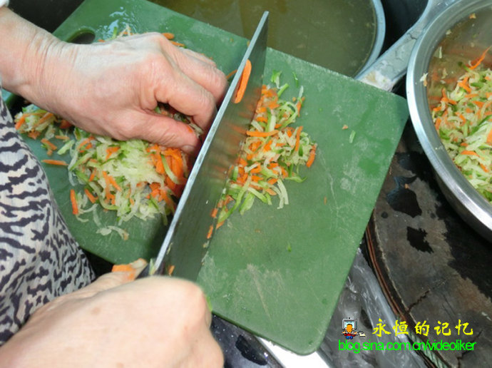 2、分别将绿皮萝卜和胡萝卜“插”成丝。