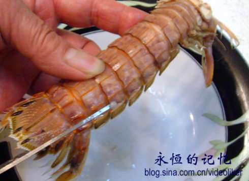 虾爬子肉虽鲜美,但它全身长有一层硬壳和边刺,一不小心,不是扎了嘴,就是扎了手。这几年学会了用剪刀先除去“障碍”再取肉的办法,这里拍摄了一张过程照片,供博友笑览。↓