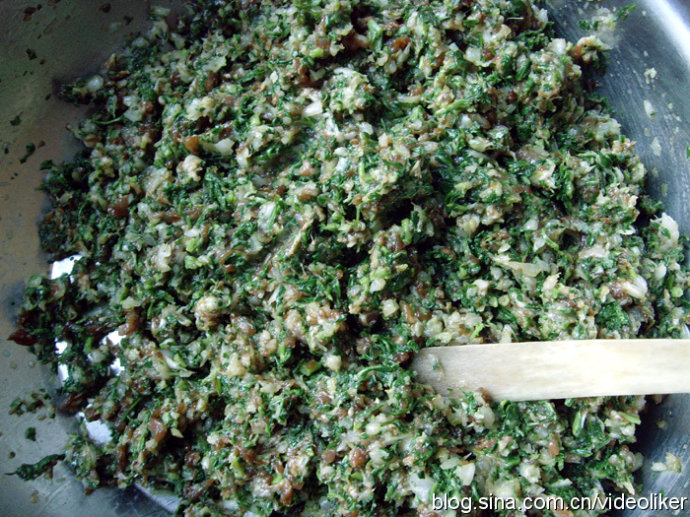第二点是荠菜肉馅的制作要精细。荠菜摘好后洗净,在开水里烫一下,捞出后用冷水“拔”一下,挤干后切成碎末。一般不添加别的蔬菜,我曾经也添加些油菜,由于都是绿色菜,尚可相配,别有一番风味。但如果配以白菜(生切成碎末),不仅影响馅外观,还容易出水,降低口味和不易保存。猪肉先剁碎,拌入姜葱末,调入盐、料酒、鸡精、少许糖和香油,加一个鸡蛋拌匀,朝一个方向搅拌上劲后,加荠菜末调和成馄饨馅。