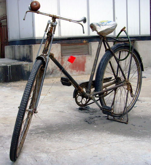 以前这辆自行车总是插着一面小红旗,说起来还挺有意思,当年老爸老妈同在一家国有企业工作,那个厂大得很,许多职工上下班都骑自行车,那个自行车棚也很大,可以停放好几千辆自行车。当时,老爸在自行车的前杠上放了一张小竹椅,我就坐在这上面,每天早上,老爸骑车将我送到托儿所,再将车送到车棚中的约定位置;老妈上下午各一次到车棚约定位置找车,再骑车到托儿所给我喂奶。由于自行车太多,即使在车棚的约定位置,有的时候也很难找到那辆自行车,后来,老爸想了个办法,在自行车的前轮轴上插了一页小红旗,老远就给老妈指示了找车位置,这两个人还挺聪明的啊。