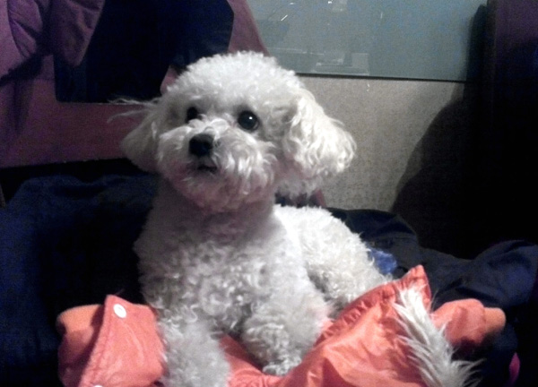 然而,"理解产生感情",这句话不仅可用在人与人之间,还可以用在人与动物之间。三个多小时的聚会中,除了我们一进门小狗狗叫了几声,只有一次它看到玻璃门外,一服务员躬着腰推啤酒箱时叫了几声外,它再没有叫过一声。它既不看饭桌上菜肴,也不闹着要下地,只是乖乖地躺在一件衣服里睡觉。我觉得很奇怪,就问LP原因。谁知这一问,可打开了LP的话匣子,她就眉飞色舞地讲起了她的家与小狗狗之间的故事。