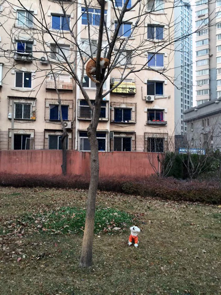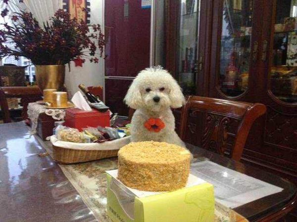 人与人,人与动物之间是有一个理解的过程,理解的过程主要是通过交往。"龙龙"的聪明可爱也感动了LP的丈夫,他对"龙龙"的喜爱甚至胜过女主人。每天早上六点半,"龙龙"会用爪子和叫声喊醒男主人,意思是已到了外出散步的时间。下午晚饭后,也是散步的时候,它又会及时地提醒外出。在小区花园散步时,"龙龙"会非常放纵,它会与野猫追逐嬉戏,有一次它把一只猫撵上一棵树,它就守在树下仰头对峙,仿佛在说"小样的,你敢下树嘛",非常的有趣(见图2)。它还经常欢快地在草地上奔跑,让男主人紧紧地在后面跟着跑,生怕它跑到小区外面走失。久而久之,奇迹出现了,男主人原本发福的肚子一点点消瘦了下来,LP风趣地说:这可都是"龙龙"的功劳。这个时候天气冷了,男主人对小狗狗就倍加关怀,他怕"龙龙"冻着感冒,特意在一件肥大衣服的领口里缝了一个大口袋,外出时,就把它放进口袋里,只让它的头露出来,如同一只大袋鼠装着小袋鼠一般,看到这情景的路人都用手指着、开怀大笑(见图3)。更可乐的是:他还给"龙龙"过生日,平时挺节省的他跑到一家知名蛋糕店里,买了一只大蛋糕,让打扮一新的"龙龙"乖乖地站在蛋糕前,伴随着背景音乐,亲自演唱"生日快乐"歌(见图4和视频之二)。当他把现场照片通过网络传给远在北京的女主人和女儿的时候,笑声中又引起女儿的一顿"忌妒"。你说有意思不?