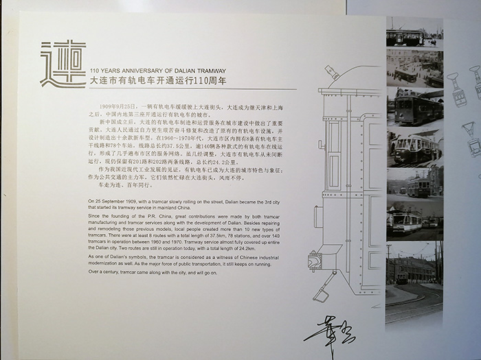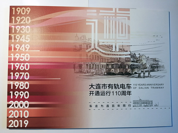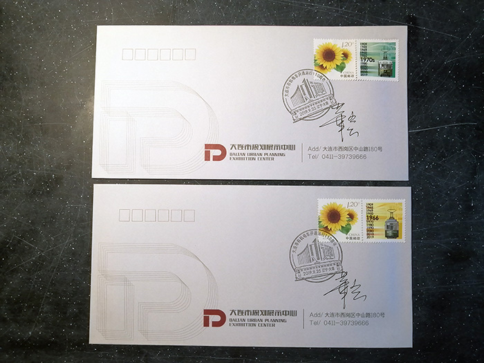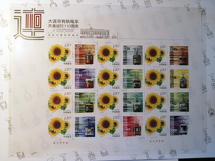 2019年9月25日早晨,我的一位好友起个大早,来到人民广场附近的大连市规划展示中心排队,为我俩申购“大连市有轨电车110周年纪念邮票”。主办方为维持销售时秩序,为先到者发放申购顺序牌,当我抵达销售地点时,门口已聚集二三百位集邮爱好者,好在好友来得早,提前领到双份顺序牌,九点钟时,我俩第一拨就被请领进销售房间,如意购买到一套由中国邮政限量发行、以《向日葵》为主票,寓意欣欣向荣主题的纪念邮票。其中12枚附票包含了12款大连市有轨电车的经典车型及涂装式样,还附带二张盖戳明信片。据了解,该套邮票是经大连公交客运集团授权后,由大连工业大学艺术设计学院高华云老师参考历史资料设计完成,高华云老师还在现场为大家在邮集本上签字留念。(图01-04)