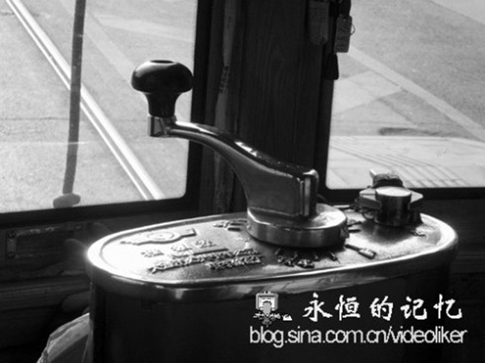 解放后,在很长一段年月,大连有轨电车车厢外形和结构没有发生多大变化。但好在不要求高速行驶,加上车厢宽敞、装客量多,仍然能够满足市区的交通需求。说起电车的操纵很有趣,司机操纵位置紧靠二个边门,不仅开车还管开关上下门(手动)、收验车票和招呼乘客上下车。驾驶室只占居中窗梯形状的一小块地盘,由于电车为双向驾驶,司机坐的位置也可坐乘客。我上车后喜欢站立在驾驶室横杆旁边,透过侧窗玻璃,不仅可以正面欣赏路轨二侧风光,还可以注视司机的驾驶方法,其驾驶方法很独特,司机用左手摇着电流控制器手把,右手掌控刹车手把,一只脚用于踏响汽笛喇叭,发出“呜呜”的声响。车厢里靠窗有四行木制长排椅子,座椅上方有四排镀铜横拉杆,拉杆上相隔一定距离装有皮绳吊环,供站立的乘客手把扶之用。直至现在,我还觉得这些吊环拉手设计挺科学,一是吊环比较低,可供不同高度的乘客握住;二是当电车紧急刹车时使站立乘客具有反方向的缓冲作用,防止相互碰撞。另外,车厢里的通风也好,座椅二侧窗都可以打开,到夏天,只要再将驾驶员两侧玻璃窗拉下,整个车厢空气流通,相当于安装了一个大空调。(图6-8)