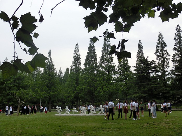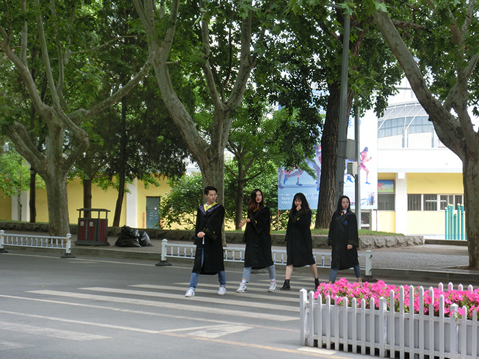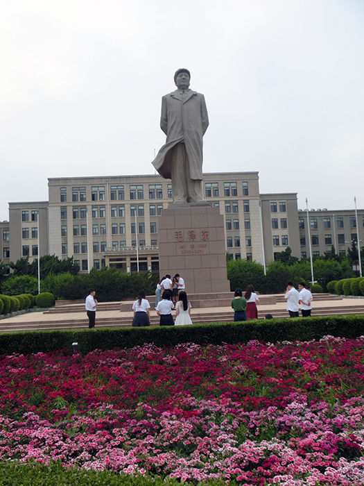 在毛主席塑像下,我遇到化工系2018届某班级毕业生正拍摄集体照,男生统一穿白衬衫系红领带,女生则穿着各异漂亮服装,正值青春年岁,风华亮丽,令爷爷辈的我无限羡慕,羡慕之余,自我宽慰当年我们也曾年轻过,又想起我辈在同一地点的那些黑白留影来,不觉哑然一笑。我看负责拍照的女生未将毛主席塑像整体拍摄进集体照里,就在后面随手抢拍了几个镜头,事后我把相机实拍的屏幕显影拿给她看,并答应回去发送,当场交流了各自QQ号码,果真,我一回家就把用PS软件处理好的七张照片发送了过去,就算老学友赠送年轻学友的一份心意吧。