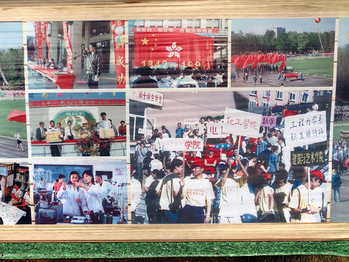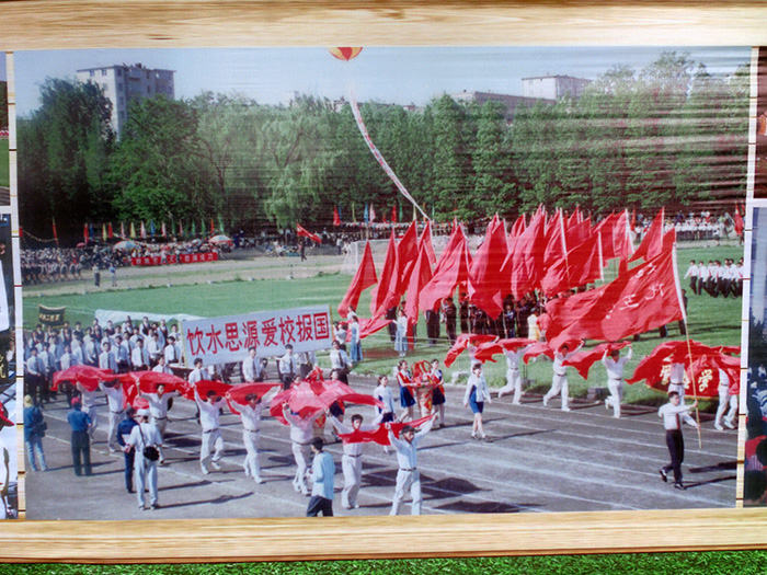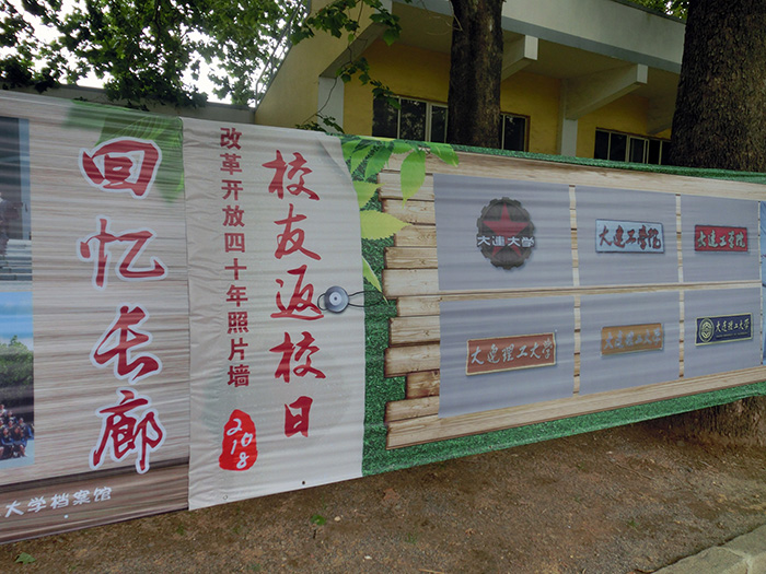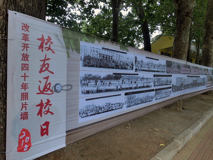 在上述绿草地东侧,有一溜近百米长的照片墙,墙之两侧写有“改革开放四十年照片墙—校友返校日”标题,墙上贴满了由母校档案馆提供的改革开放四十年以来的部分系、部分届的毕业班合影照片,自然没有我们6511的合影照片。不过,观摩这些黑白照片或初期彩照也有一番情趣,从当年这些毕业生的穿戴仿佛也看到当年我们衣衫模样,对比今日之在校学友的穿戴水平真是无法比拟的。