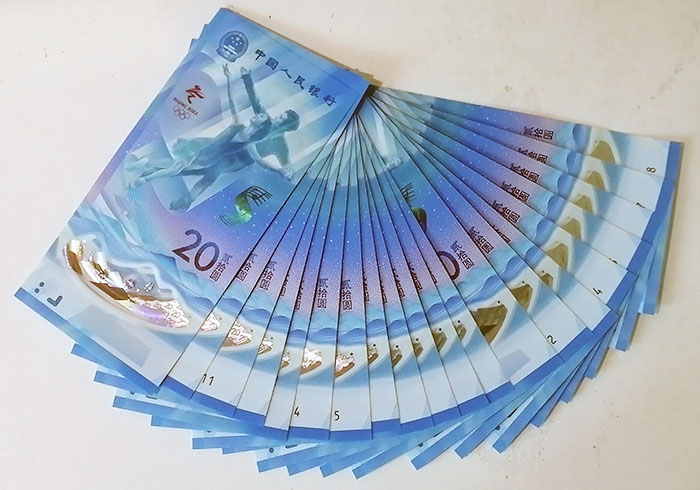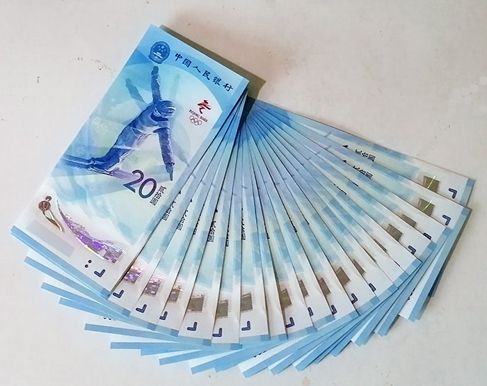由于已是兑换期第二天,在柜台前排队等候兑换的人不多。我用800元人民币兑换了二人份最大预约数量(10套/人)共计40张。其中,画面为冰上运动项目的塑币20张,画面为雪上运动项目的纸币20张。