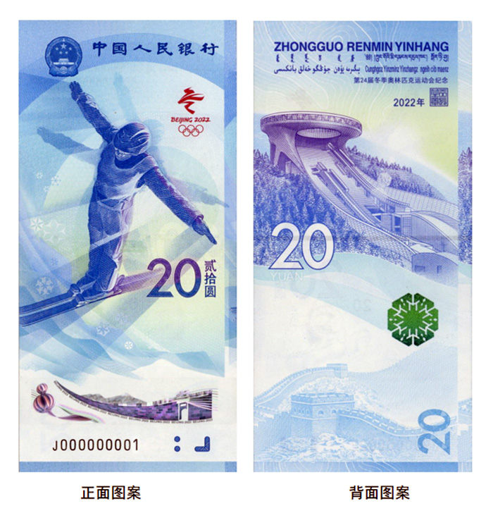 正面图案:主景为单人自由式滑雪运动员图案。上方左侧为中华人民共和国国徽、“中国人民银行”行名。运动员右上侧为第24届冬奥会会徽,右下侧为面额数字“20”与数字“贰拾圆”标记。票面下方为动感全息图案(在灯光下转动钞票可看到滚动的“20”数字)、雕刻凹印、盲文面额标记和以“J”冠头的钞票9位数编号。