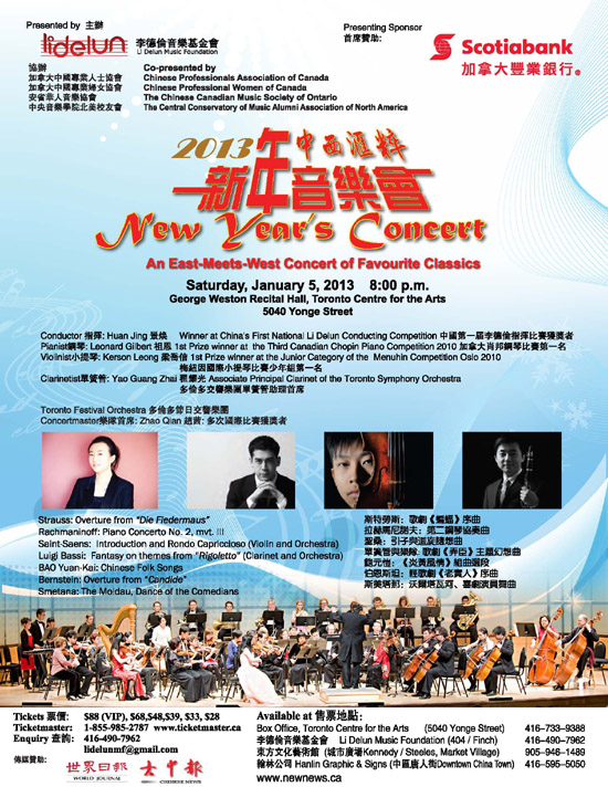 【加国生活网】李德伦音乐基金会分别于2012年12月7日和12月28日举行新闻发布会,基金会理事长李燕宣布“2013中西汇粹新年音乐会”定于2013年1月5日登台。这是以多伦多节日交响乐团为主体的维也纳新年音乐会式的大型音乐会,届时中西乐手连袂,中西名曲交织,欢乐贺岁迎春。