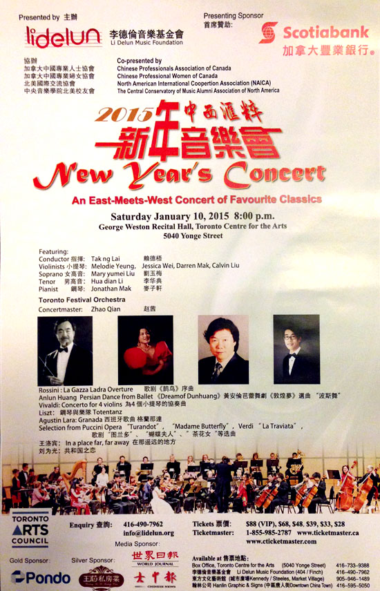 小编最新爆料:由李德伦音乐基金会主办的“2015中西汇粹新年音乐会”于1月10日在Toronto Centre for the Arts 成功举行。这是一场以多伦多节日交响乐团为主体的维也纳新年音乐会式的大型音乐会,同时又加入中国音乐。音乐会以歌剧《鹊鸟》序曲拉开了序幕,紧接着是4位多伦多青少年小提琴手Melodie Yeung、Jessica Wei魏喜儿、Darren Mak麦骏升、Calvin Liu 表演Vivald为四个小提琴所写的协奏曲,之后是男高音歌唱家李华典演唱了王洛宾写的歌曲“在那遥远的地方”等歌曲以及黄安伦作曲的芭蕾舞剧《敦煌梦》之波斯舞曲;在下半场演出中,青少年钢琴家麦子轩Jonathan Mak 演奏了李斯特为乐队和钢琴写的单乐章作品“Totentanz”、女高音歌唱家刘玉梅演唱了“我爱你中国”等歌曲,之后又与李华典合唱了“共和国之恋”、歌剧《茶花女》选段《饮酒歌》。这些精彩的演出获得了一次又一次的雷鸣掌声。详情请欣赏小编在现场拍摄的一组视频: