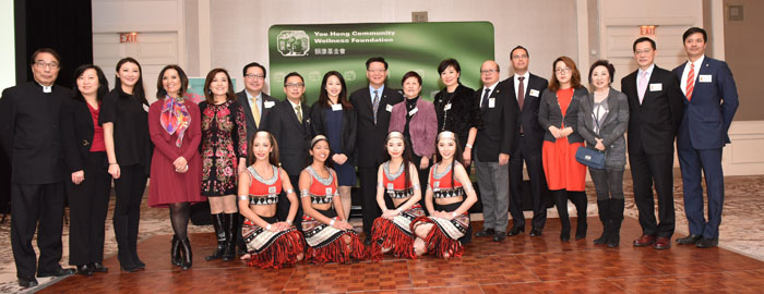 颐康创办人及基金会主席王裕佳医生(中)、第28届龙宴筹委会共同主席Scott Delaney(右五)及温建业会计师(左六),与部份赞助商及“小梨园”舞蹈员合照。第28届龙宴获二十多家赞助商支持。