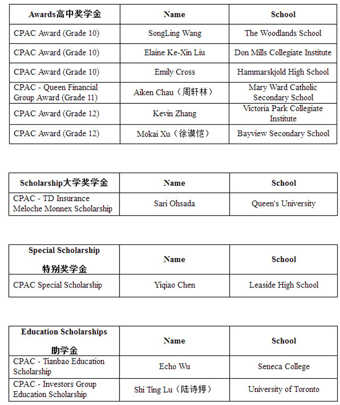 如需了解更多获奖学子的介绍,请浏览CPAC基金会网站www.cpacfoundation.ca。