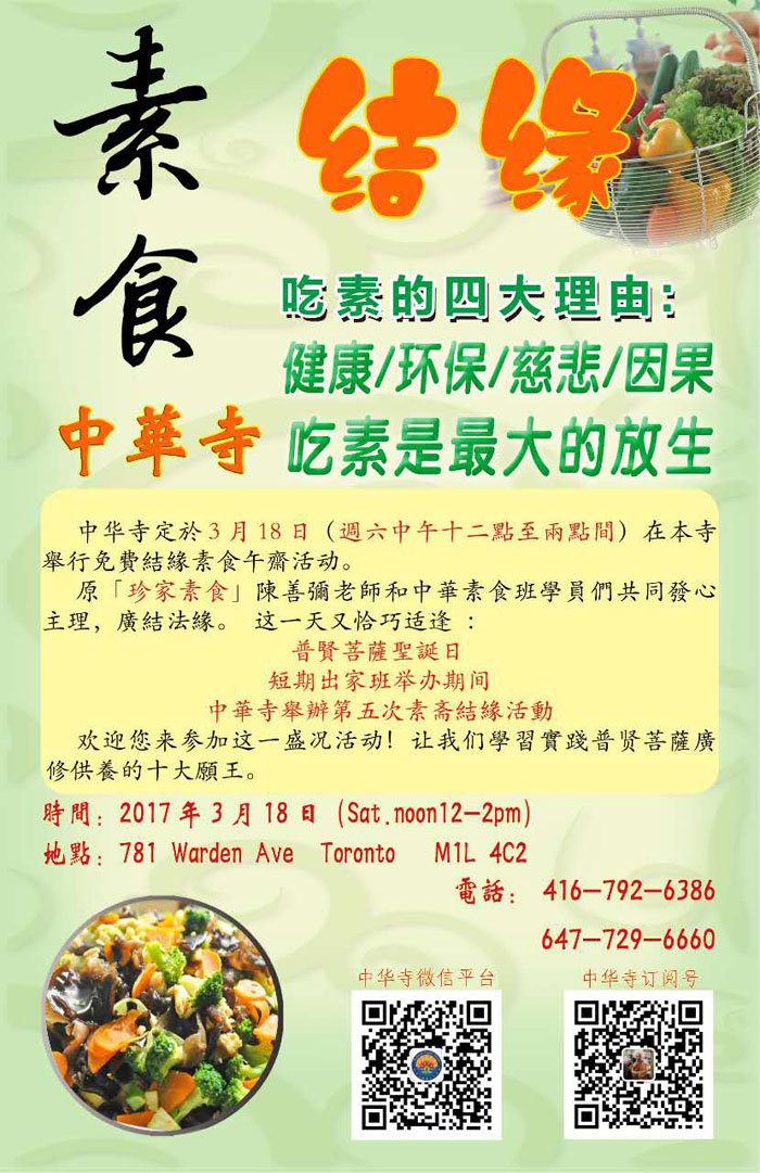 加拿大中华寺定于2017年3月18日(本周六中午12时至2时)在寺内举办免费结缘素食午斋活动,邀请了原主理‘珍家素食’的陈善弥老师与中华寺素食班的义工们共同发心,烹饪精美的素菜,广结法缘。