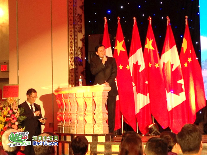 何炜总领事在致辞中表示,来到多伦多虽仅半个月,但通过走访和交流,已强烈感受到领区人民对中国人民的友好及对加强中加交流合作的期盼,深感使命光荣、责任重大。何总领事简要介绍了中国经济发展最新情况和新一轮深化改革、扩大开放的重要举措,回顾并展望了中加关系进入新的“黄金时代”后两国及中国与领区间各层级务实合作的发展,高度评价领区华侨华人为推动双边关系发展作出的积极贡献,表示将率领总领馆全体同事一起“撸起袖子加油干”,推动中国与领区开展更多务实合作并惠及双方民众,继续践行“以人为本、外交为民”理念,全力维护领区中国公民和企业合法权益,并努力为侨胞提供更加优质便利的服务。