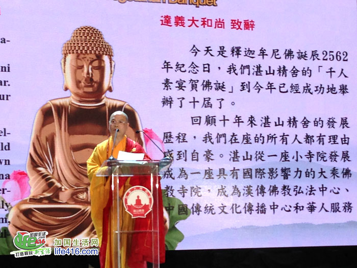 湛山精舍主持达义大和尚表示,千人素宴贺佛诞已经成功地举办了十届,湛山举办这一活动,目的有三:一是用浴佛的形式来洗涤我们内心的污垢和尘埃,光大佛教事业,让更多的人认识佛教,得到佛法利益;二是推广素食文化,造福社会,惠及人群;三是宣传加国佛教四大名山的建设,让更多的人投入到这一利在当代、功在千秋的伟大事业中来。