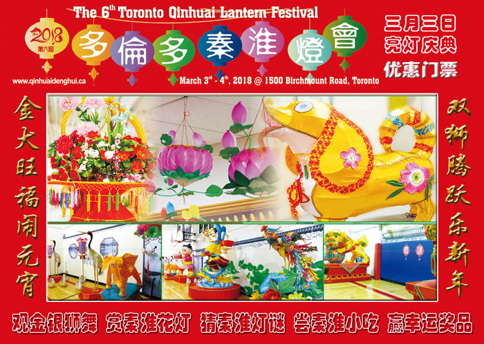 【加国生活网】“金犬旺福闹元宵,双狮腾跃乐新年”!2018-第六届多伦多秦淮灯会以“秦淮风、枫叶情——金犬旺福闹元宵”为主题,由安大略-江苏友好协会和江苏海外交流协会联袂主办、江苏省侨务办公室特别支持,定于2018年3月3日星期六下午6点,在多伦多秦淮灯会会场(1500 Birchmount Road, Scarborough, M1P 2G5)举行“金犬旺福闹元宵”亮灯庆典,并将在当天举行“秦淮风,枫叶情”加中友好主题文化体验活动。欢迎社区民众踊跃订票(现场购票$15一张,幸运赠票和优惠门票请登录https://2018denghui.eventbrite.ca 预订),亲临灯会,与吉祥犬-福旺一起,观金银狮舞,赏秦淮花灯,猜秦淮灯谜,尝秦淮小吃,闹元宵,同接福,旺新年。