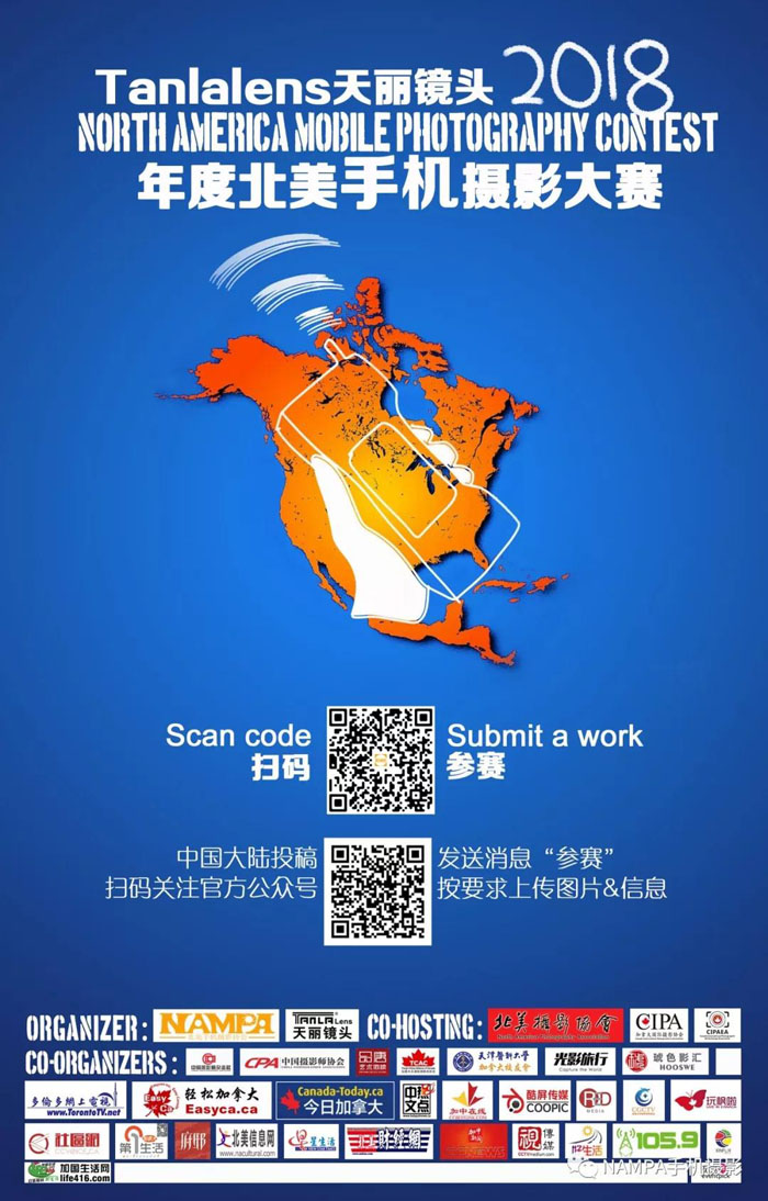 北美手机摄影协会携手北美摄影协会、加拿大国际摄影艺术交流协会、加拿大国际摄影协会共同打造北美最具关注度的手机摄影比赛——天丽镜头2018年度北美手机摄影大赛正式启航!五大组别,多个主题门类,国内外顶尖摄影大咖评委,金银铜,金枫奖,大师奖,绶带奖众多大奖等你拿,邀你用手机影像与世界沟通!