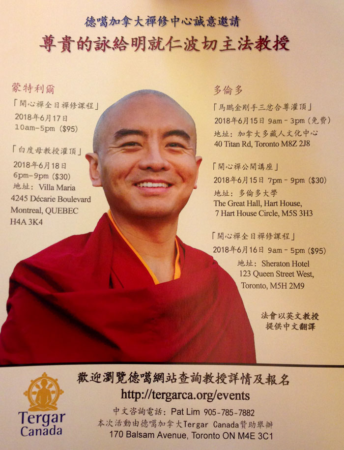此次“尊贵的咏给明就仁波切—2018年加拿大教学之旅” 的公开活动和教学是由德噶加拿大禅修中心Tergar Canada主办、加拿大佛教文化促进会协办的,届时