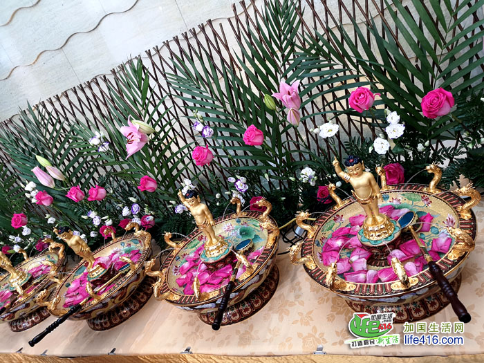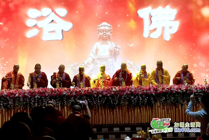 随后,千人素宴举行了庄严而隆重的浴佛仪式,各位法师、功德主和特邀嘉宾依次上台浴佛。自古以来在佛诞,佛教寺院都会举行盛大的浴佛仪式,祈求佛陀福泽社会,消弭灾难,以及礼请法师开坛说法。佛教徒也会在这一天回顾和学习佛陀的慈悲教导。本次活动湛山精舍还特别邀请了加国五台山发起委员们会莅临会场,共襄盛举。