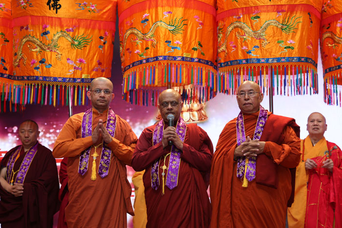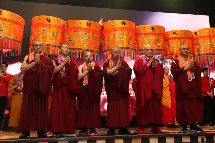 达义大和尚带领三大语系高僧在会场甘露遍洒