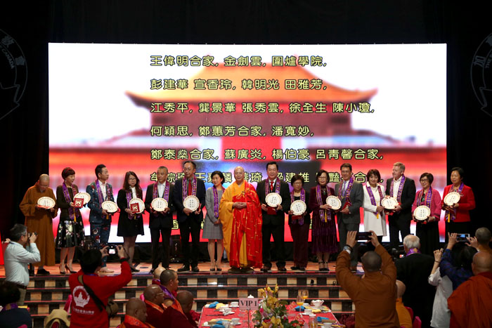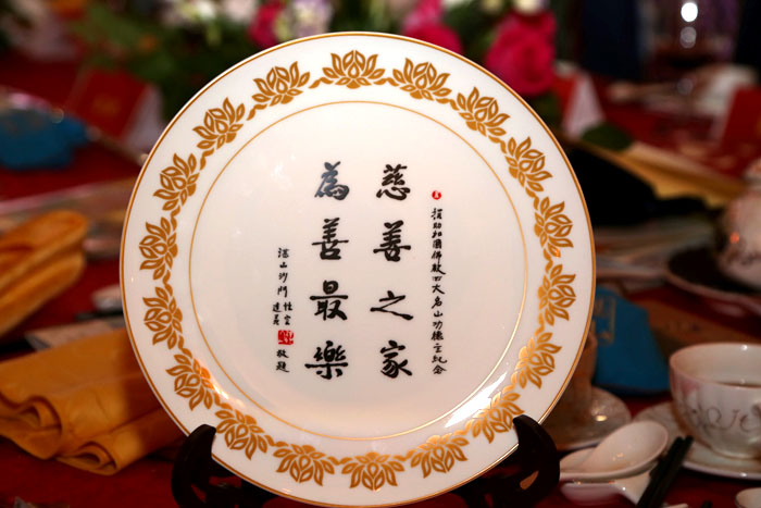本次活动中,达义大和尚邀请当晚到场的70多位护法委员代表上台,亲自一一为大家颁发由性空长老亲笔撰写的墨宝“慈善之家为善最乐”,特制的奖盘赠送给大家,同时也向大家颁发五台山大殿落成佛像开光的邀请函,以表谢意。好多人也是为大和尚的呕心沥血筹建五台山而感动动容,现场场景感动着所有人员。