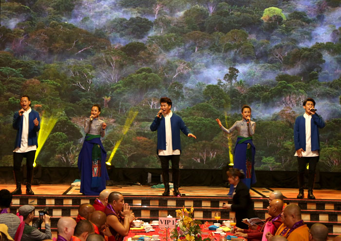 在感动中,大家也欣赏了陀乐乐团带来了天籁一般的梵呗音乐。他们将传统的非遗文化传承藏族唱经调与民间音乐、现代音乐元素完美结合,让历经千年的古老艺术和文化,在传承与创新中永恒延续,让听众在进入音乐的美妙世界的同时,体悟佛法和禅味。他们为千人素宴演唱了《大地恩情》《千年之约》《吉祥如意》等,堪称完美的音乐艺术的呈现,让观众耳目一新,久久不愿离去。